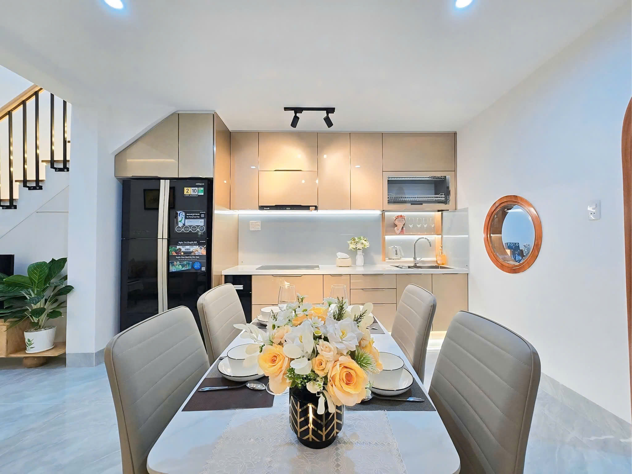 Tông vàng be nhạt mang đến cảm giác ấm áp và gần gũi cho căn bếp, mà vẫn giữ được sự tinh tế, nhẹ nhàng. Màu này rất dễ kết hợp với các phong cách nội thất như Scandinavian, hiện đại hoặc Indochine nhẹ nhàng.