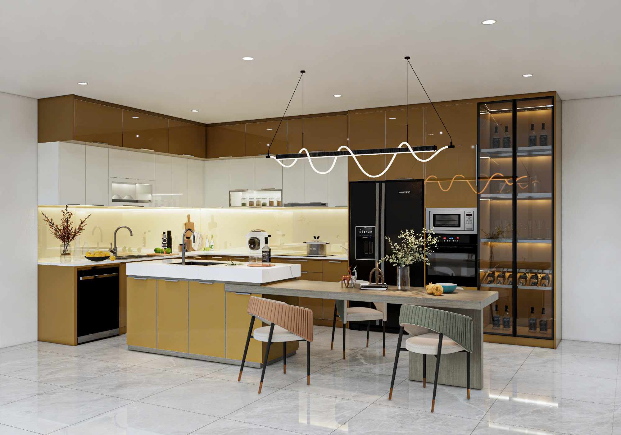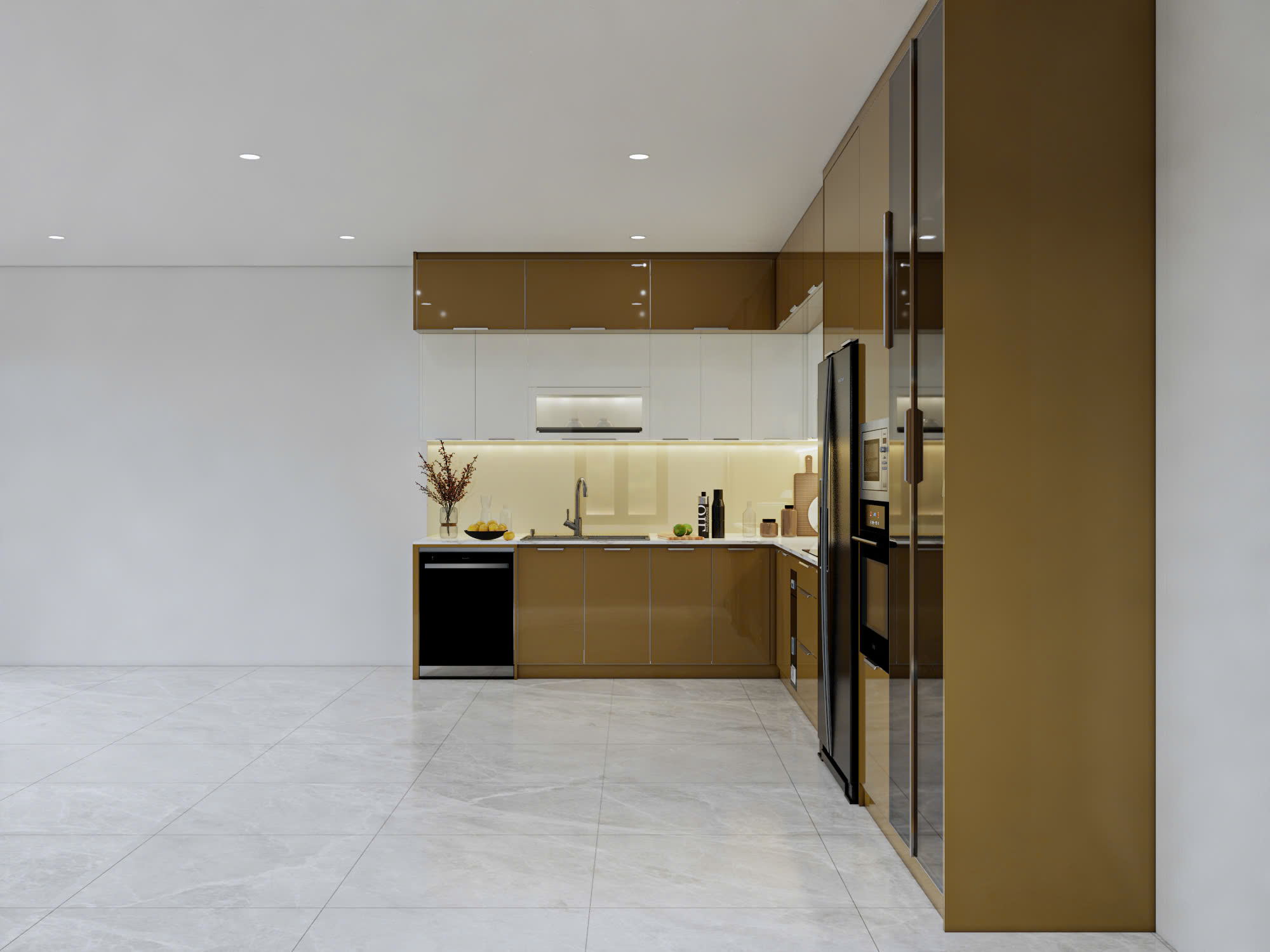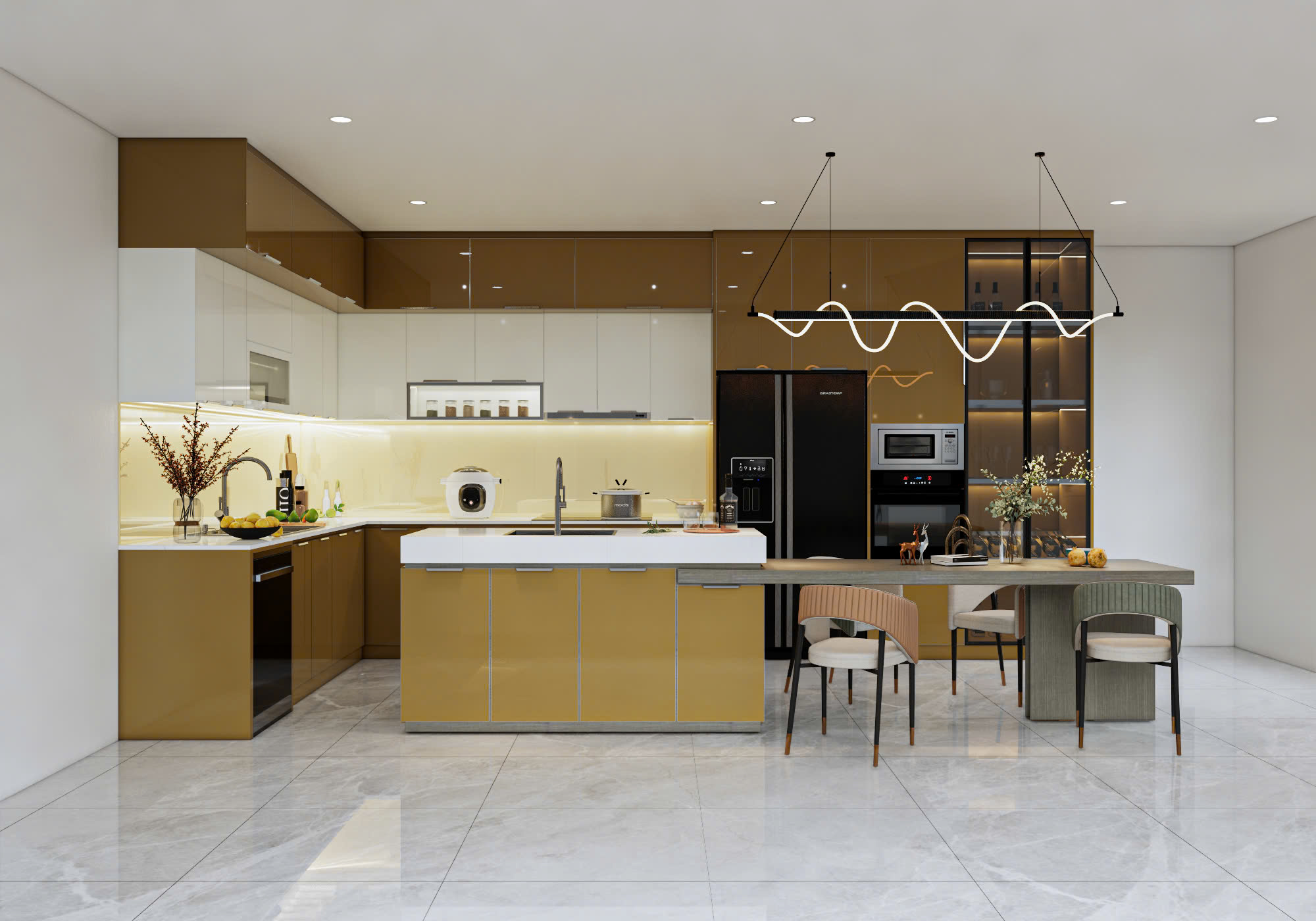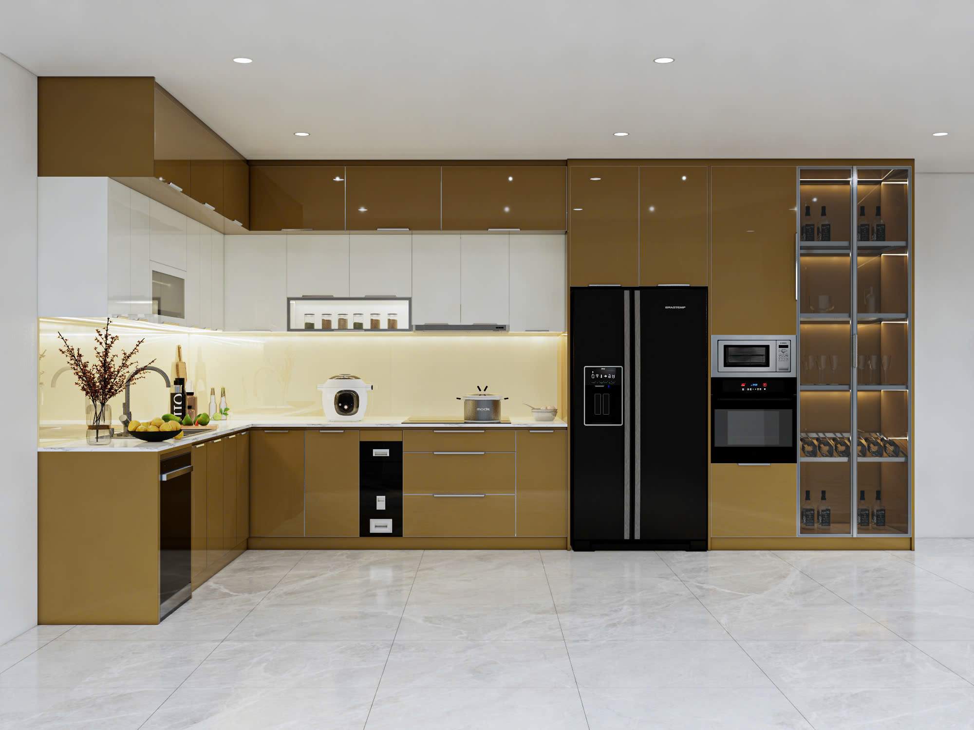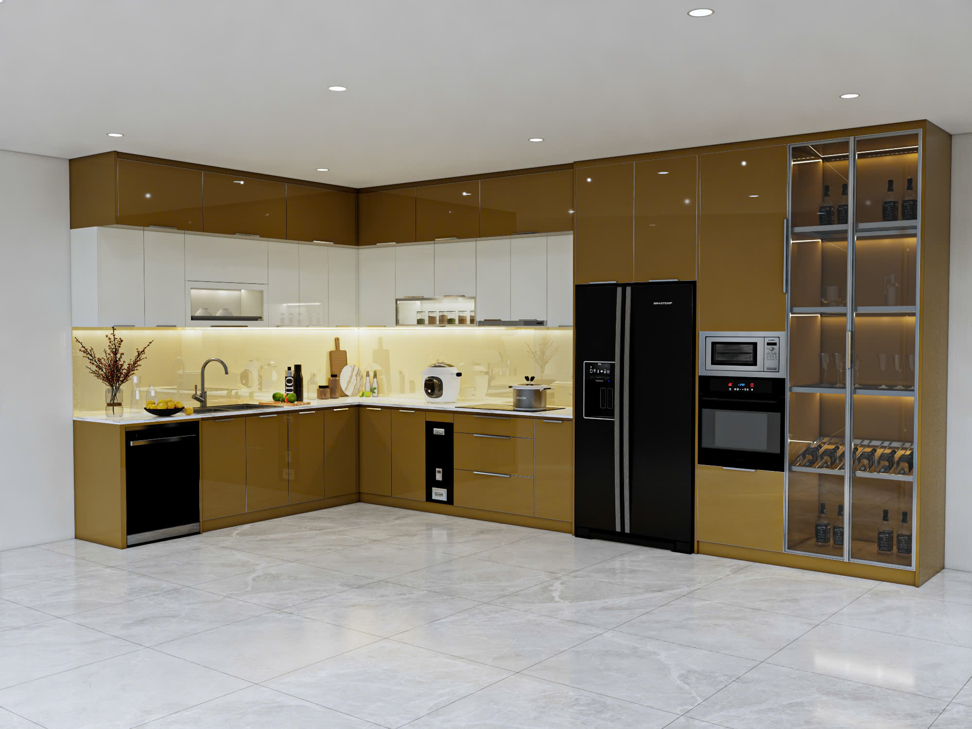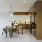 Anh Quân mong muốn sẽ có một căn bếp màu vàng kim hơi ngả nâu cho căn nhà mới của mình thêm sang trọng. Và ột không gian bếp hiện đại, sạch sẽ, dễ vệ sinh, đồng thời phải bố trí hợp lý các thiết bị như: bếp từ, máy rửa chén, tủ lạnh, chậu rửa… Tủ bếp cần thiết kế gọn gàng, tinh tế nhưng vẫn đảm bảo sự ấm cúng và tiện lợi trong sử dụng hằng ngày.