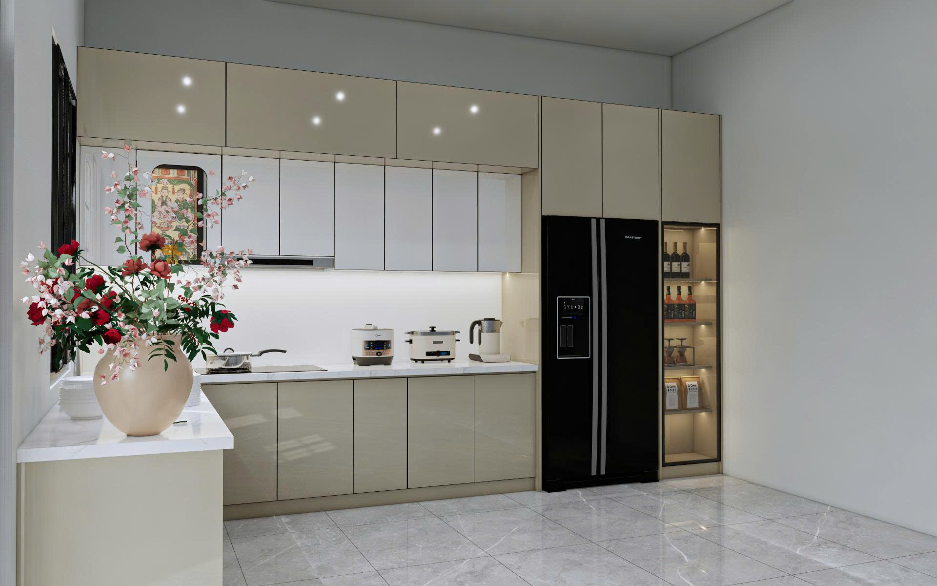 Bác sĩ Bình mong muốn xây dựng tủ bếp hiện đại, tinh giản nhưng vẫn đầy đủ tiện nghi. Một không gian bếp hiện đại, sạch sẽ, dễ vệ sinh, đồng thời phải bố trí hợp lý các thiết bị như: bếp từ, máy rửa chén, tủ lạnh, chậu rửa… Tủ bếp cần thiết kế gọn gàng, tinh tế nhưng vẫn đảm bảo sự ấm cúng và tiện lợi trong sử dụng hằng ngày.