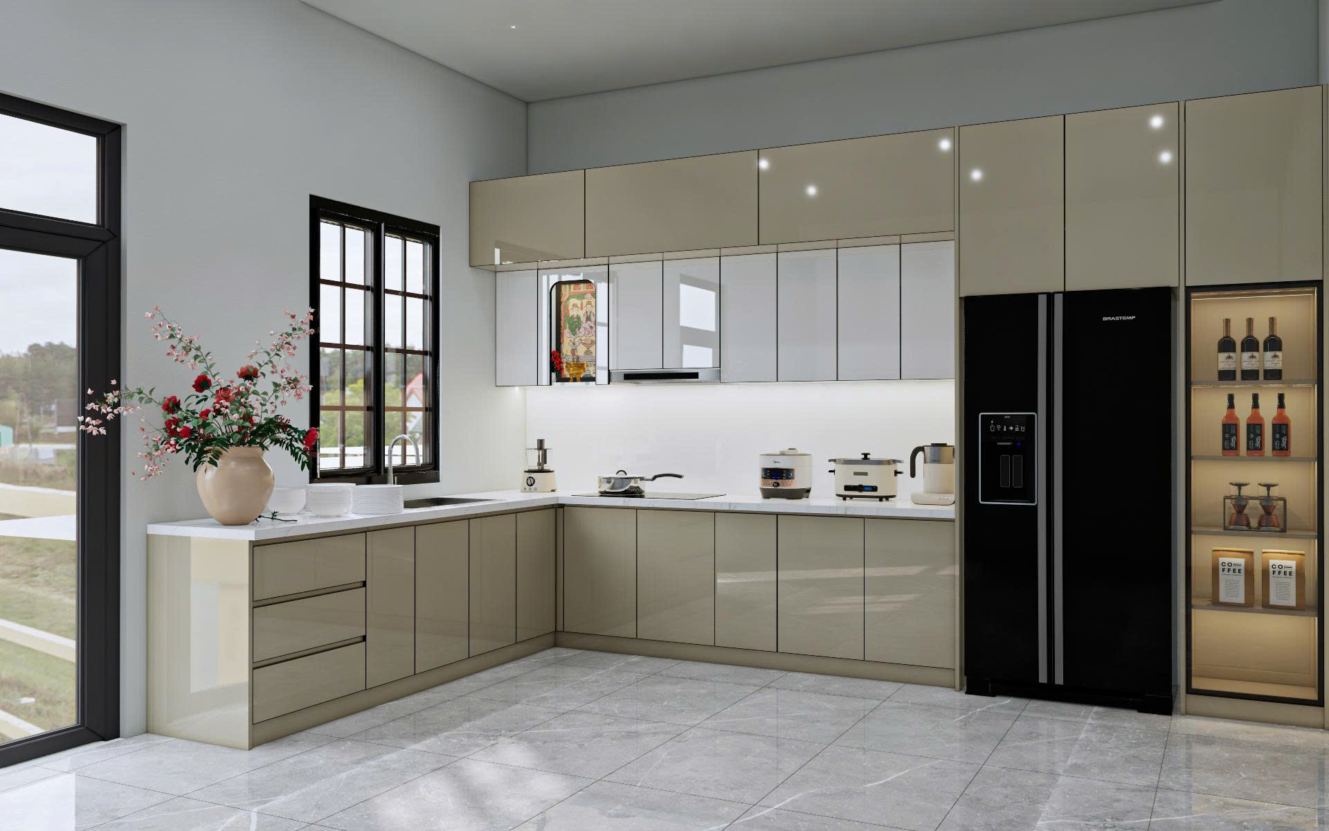 • Thiết kế hệ tủ bếp chữ L hiện đại, phù hợp với diện tích căn bếp và thói quen nấu nướng của gia đình.
